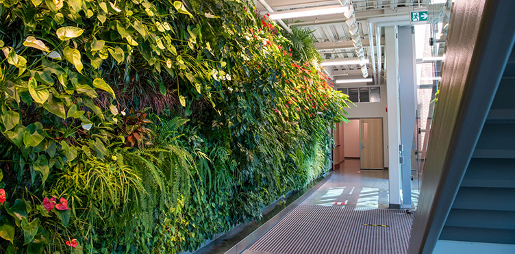 Living walls (like the one in UNB Fredericton’s Kinesiology Building) are great for improving air quality, reducing noise and increasing the aesthetic appeal of a space.
