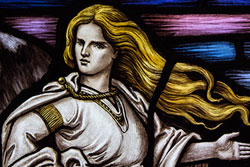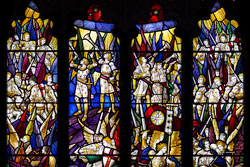 Franklin Sharp RankinA member of the 28th New Brunswick Dragoons, Rankin became a lieutenant of the Royal Flying Corps. He was tragically shot down over Bapaume in 1916. This window dedicated by his father, Dr. W.D. Rankin, features the triumph of good over evil in John Milton’s Paradise Lost.