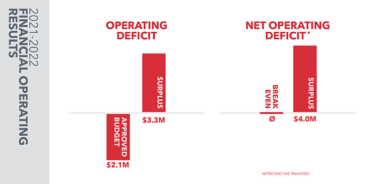 Actual results were better than budgeted. With stronger than budgeted ancillary operations, a one year freeze on Professional Expense Accounts and unexpected salary savings, the university ended the 2021-22 fiscal year, with a $3.3 million operating surplus.