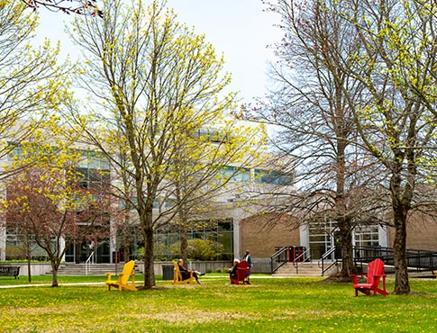 The quad* in front of the K.C. Irving Hall is a great location to get those group photos! With lots of picturesque greenery and open spaces, it’s the perfect place to toss your grad cap in the air or pose on one of the colourful Adirondack chairs.