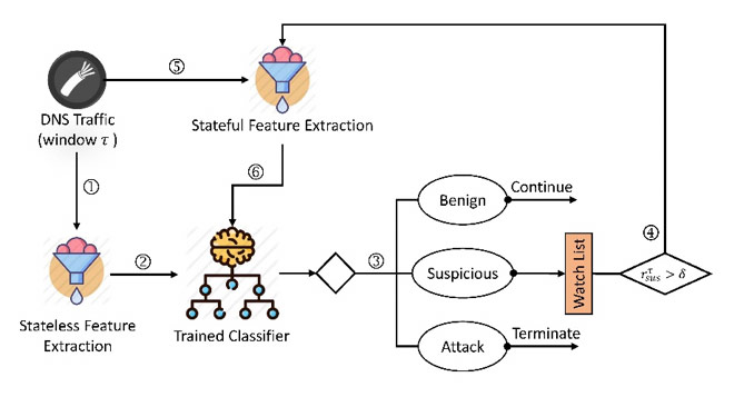 If the ratio of the suspicious samples in window τ, i.e., r_sus^τ, exceeds the threshold δ, the whole traffic window is re-analyzed using stateful features to let the trained classifier on stateful features decide about the whole window τ. Otherwise, the input sample is either identified as benign for which the DNS traffic keeps on flowing or is detected as attack for which we terminate the DNS traffic.