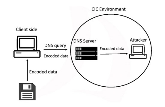 Figure 2 explains how data exfiltration attack using DNS is run on the Canadian Institute for Cybersecurity (CIC) testbed. The data is encoded on the client-side (victim's side) and piggy-backed on DNS requests to the DNS server set as the name server of the attacker's machine. Practically, the server-side (attacker's side) acts as a malicious DNS server and receives the encoded file. The file is then decoded to see the content.
