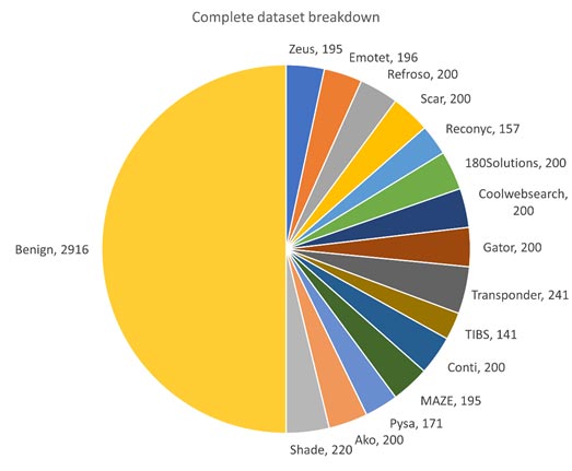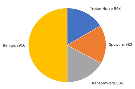 The obfuscated malware dataset focuses on simulation of real-world scenarios. Figure 1 shows the breakdown of benign and malicious memory dumps. Figure 2 shows the breakdown of what malware families are used in each malware category for Spyware (a), Ransomware (b), and Trojan Horse (c) malware. Figure 3 shows the overall malware families used in the whole dataset.