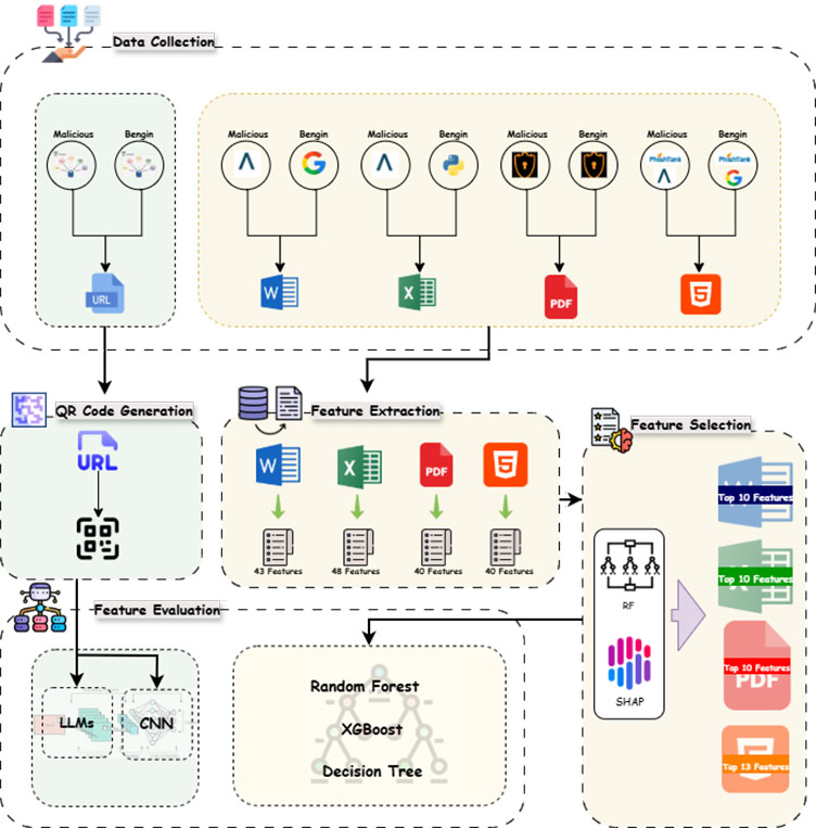 For each file format, the dataset contains balanced benign and malicious samples systematically collected from verified repositories complemented with benign samples obtained via controlled web crawling as well as synthetically generated document files. For the four document-based formats (Word, Excel, PDF, HTML), static feature extraction pipelines were designed to capture structural, content-level without requiring file execution, thereby enabling safe offline analysis.