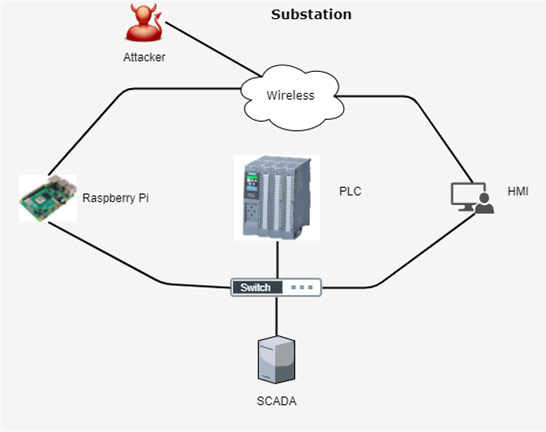 Both Raspberry Pi and the HMI are on the same wireless network. The attacker can access to this wireless network and will perform the various attack scenarios. The impact of the attacks will be observed on the level of software such as the HMI application, on the level of protocols such as network traffic of Modbus, DNP3, and IEC61850, and on the level of devices such as physical device ON/OFF status.
