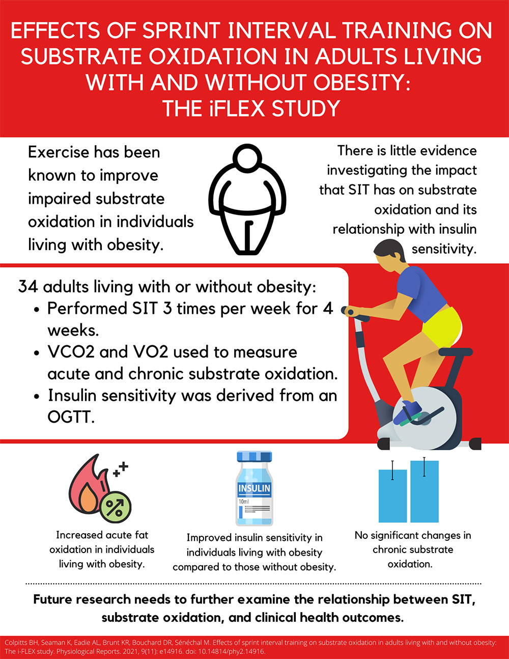 Colpitts, B. H., Seaman, K., Eadie, A. L., Brunt, K. R., Bouchard, D. R., Sénéchal M. Effects of Sprint Interval Training on Metabolic Flexibility in Adults Living with Obesity: the i-FLEX Study. Physiological Reports, 2021, 9(11): e14916.