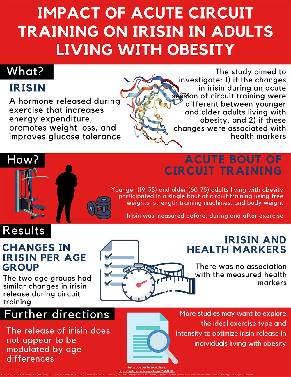 Rioux B.V., Brunt K., Eadie, A., Fox J., Bouchard D.R., Sénéchal M. The Impact of Acute Circuit Training on Irisin in Younger and Older Adults Living with Overweight or Obesity: The REACTION Study. Journal of Applied Physiology, in press, 2021.