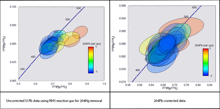 For young zircon targets, even small amounts of 204Pb contamination can push isotope ratios (mostly 207Pb/235U) off Concordia. In cases where accurate measurement of 204Pb contamination is critical, the Agilent 8900 is operated in MS/MS mode and a small flow of NH3 in the reaction/collision cell can be used to effectively eliminate 204Hg interfering on 204Pb: Hg reacts strongly with NH3 whereas Pb intensities are preserved at >85% levels. The combined He + NH3 in the cell does cause some reaction with U and care needs to be taken to adjust ORS settings to ensure appropriate sensitivity for 238U and 232U. This setup is most appropriate for crater sizes >20 µm. A recent run in this mode using a 26 µm crater achieved 204Pb average detection limit of 0.038 ppm and accurately corrected data points with between 2 and 5 cps net 204Pb.