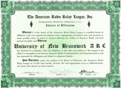 The affiliation certificate is signed by Harry J. Dannals, W2HD, Former ARRL President and Richard Baldwin, W1RU, Former ARRL Secretary, ARRL General Manager and IARU President; it is dated September 17, 1977.
