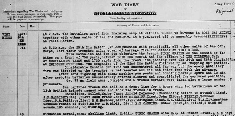 Instructions issued to 26th battalion before the battle.Once inside the German trench line, soldiers of the 26th Battalion spent the rest of the day clearing German strong points and preparing for possible counter-attacks and supporting the 25th Battalion (The Nova Scotia Rifles) in the next phase of the attack further up the ridge.