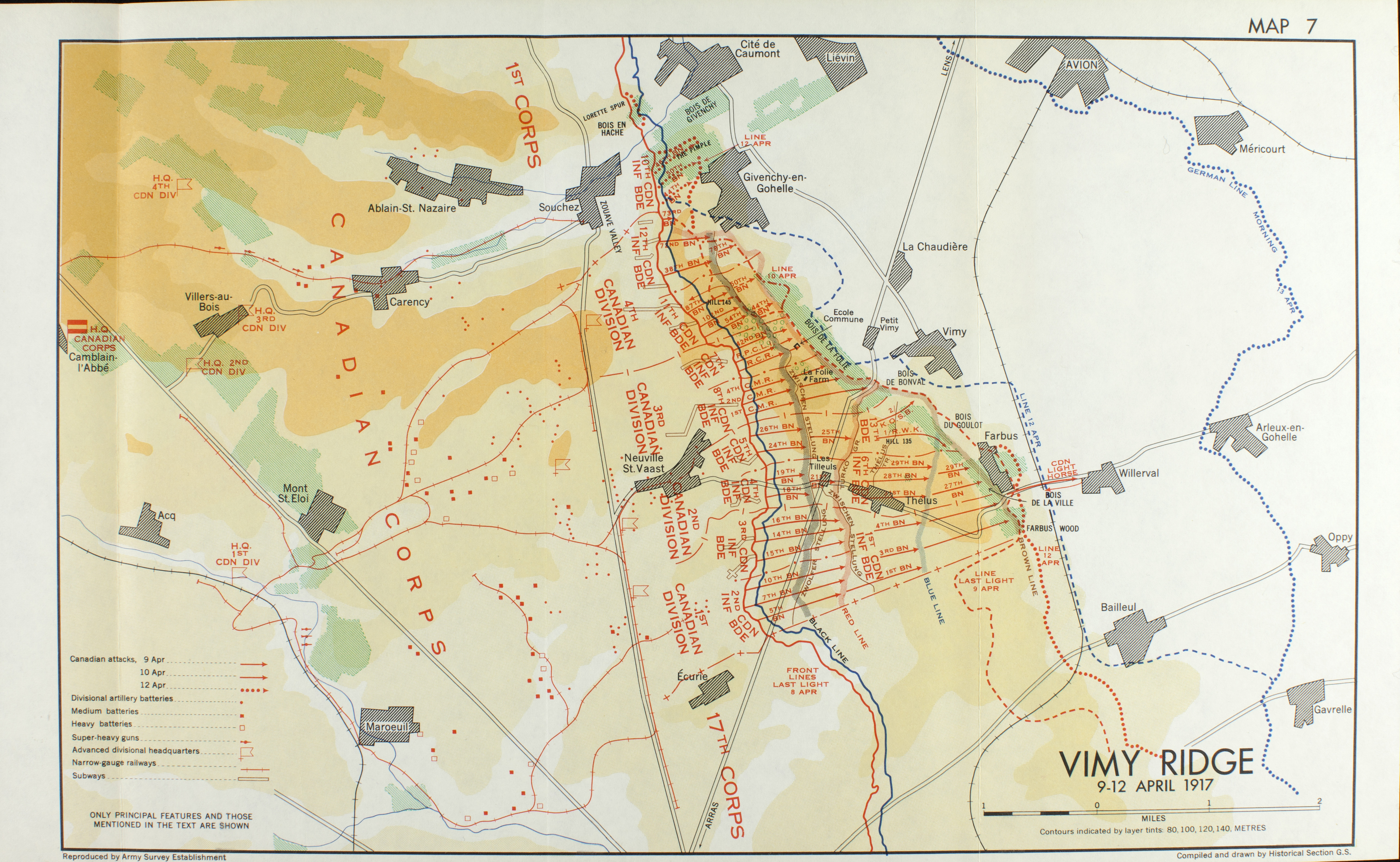 On April 9, the 26th Battalion (Fighting New Brunswick) formed part of the initial assault wave in the centre of the Canadian line attacking eastward from Neuville-St-Vaast. Their mission was to reach and capture a section of the first German main trench code-named the BLACK LINE.