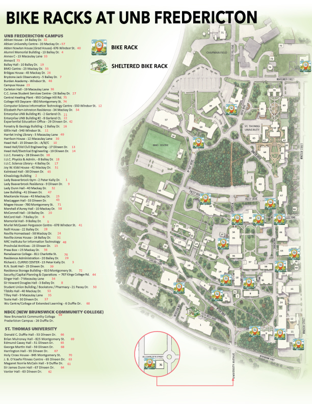 Bicycle racks shall be provided as needed at various locations on campus. Refer to the campus map for both UNB Fredericton and Saint John for exact location.